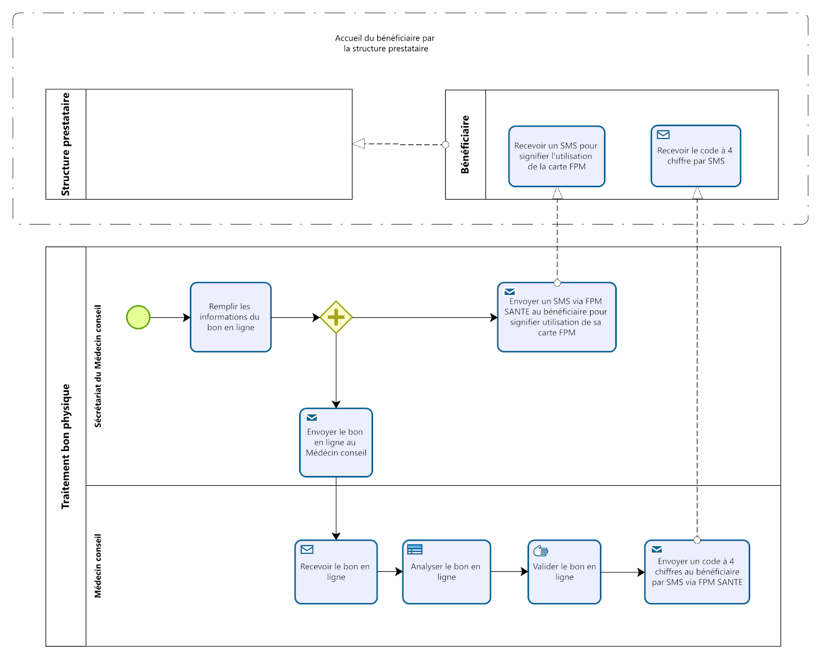 - Remplissage des Informations du Bon en Ligne: Le secrétariat du médecin-conseil saisit les informations nécessaires dans le système en ligne FPM Santé. Cela inclut les détails personnels du bénéficiaire, les informations médicales pertinentes et les spécifications des soins requis.