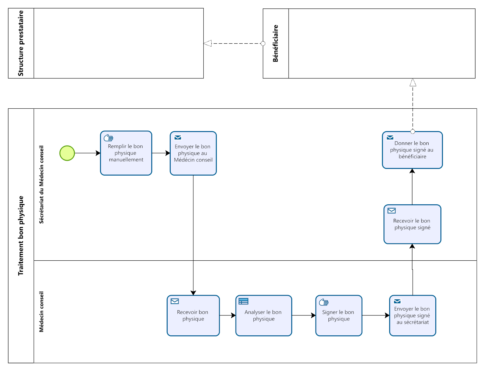 - Remplissage Manuel du Bon Physique: Le secrétariat du médecin-conseil remplit manuellement le bon de prise en charge physique en s'assurant que toutes les informations nécessaires sont correctement indiquées.
